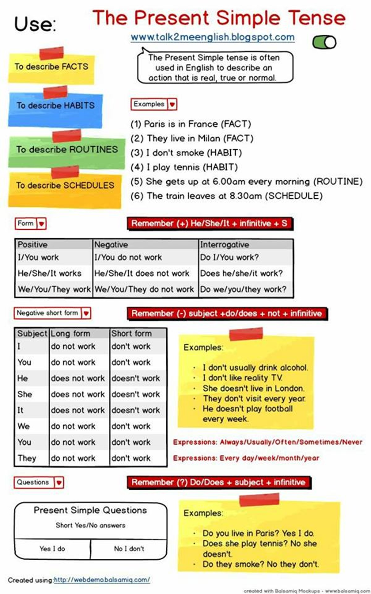 | Present Simple | I eat lunch at noon. | Regular actions, facts |