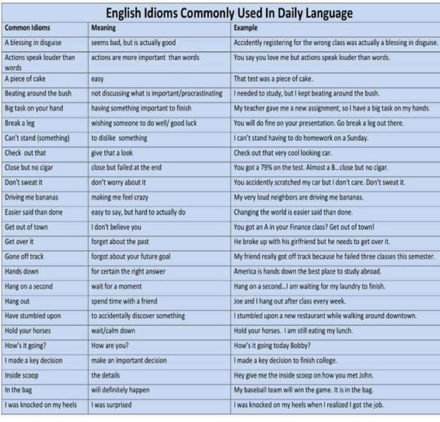 A blessing in disguise, actions speak louder than words, a piece of cake, beating around the bush, break a leg, can’t stand it, check out that, close but no cigar, don’t sweat it, driving me bananas, easier said than done, get over it.