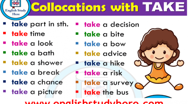 Collocations with “take” such as take part in something, take time, take a look, take a bath, take a shower, take a break, take a chance, take a picture, take a decision, take a bite. See where you can use these other collocations with take.